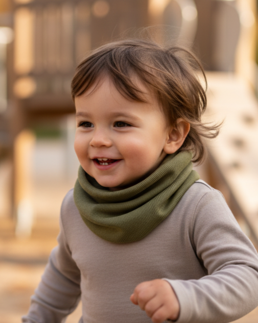 Keď sa ochladí a fúka vietor, nákrčník v odtieni military spoľahlivo ochráni krk tvojho drobca. Je vyrobený z jemného rebrovaného úpletu, vďaka čomu je maximálne pohodlný, pružný a jednoduchý na obliekanie. Tunelový strih stačí len pretiahnuť cez hlavičku – bez viazania, bez starostí.